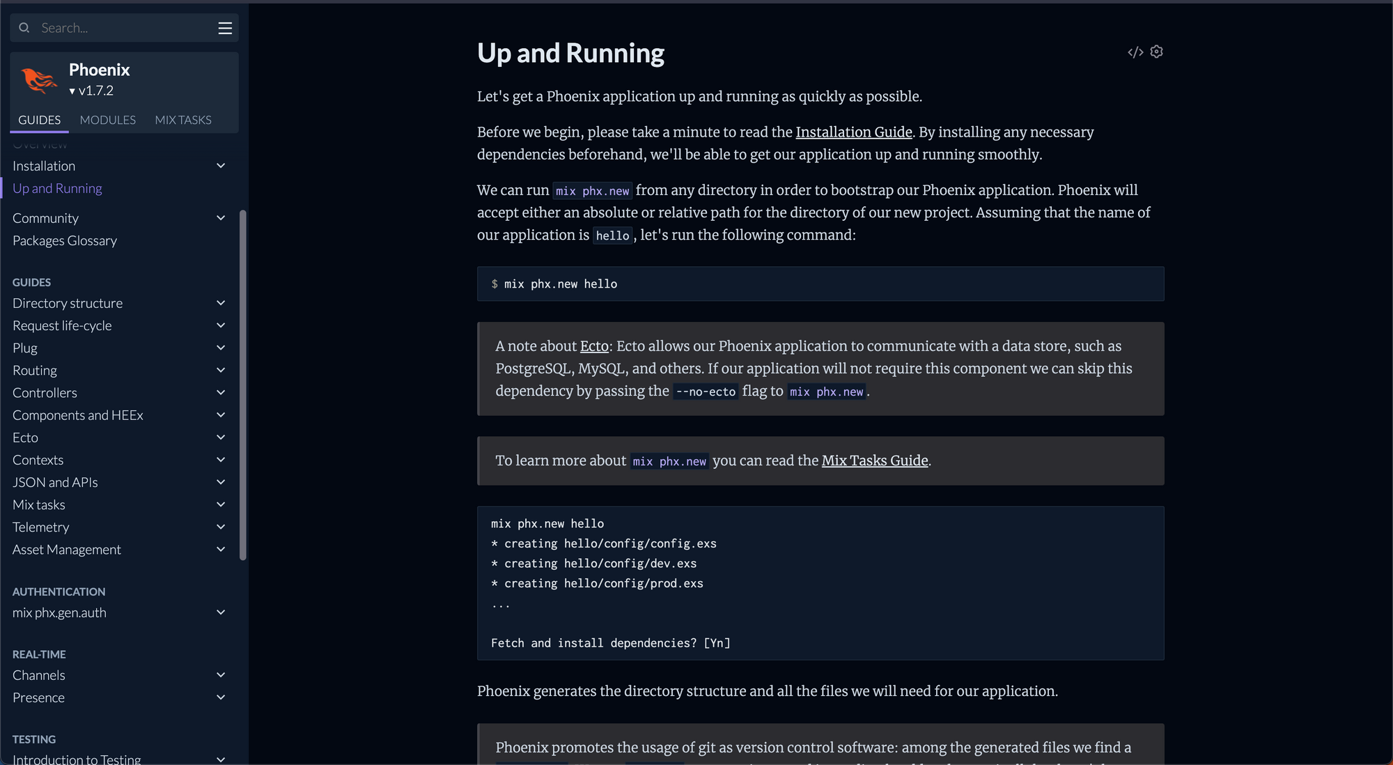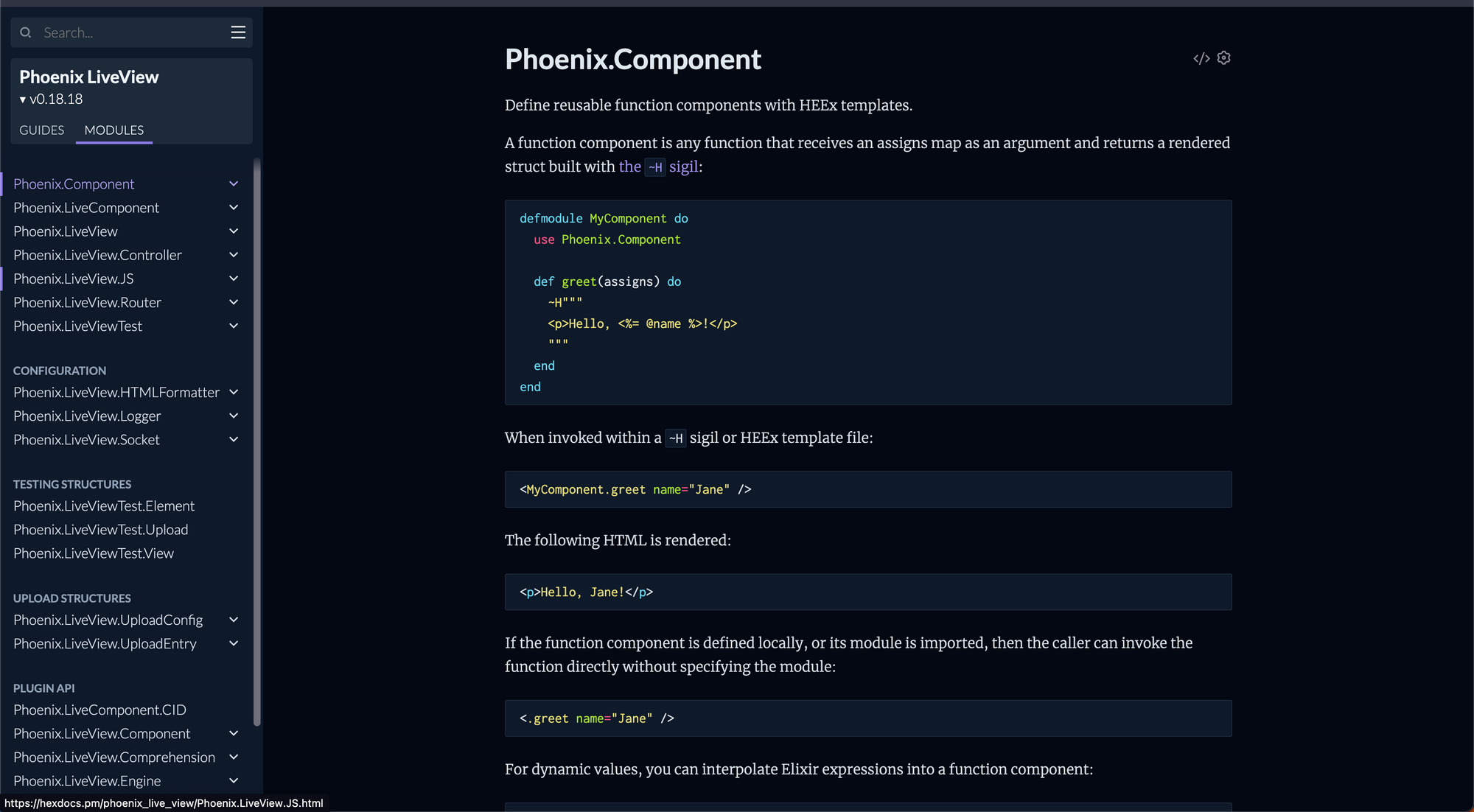 For example, when learning Phoenix LiveView, there are modules for rendering HTML, adding interactivity , testing, etc. As a fun experiment, try finding the LiveView documentation based on this screenshot of the Phoenix documentation home page under the "Guides" tab.