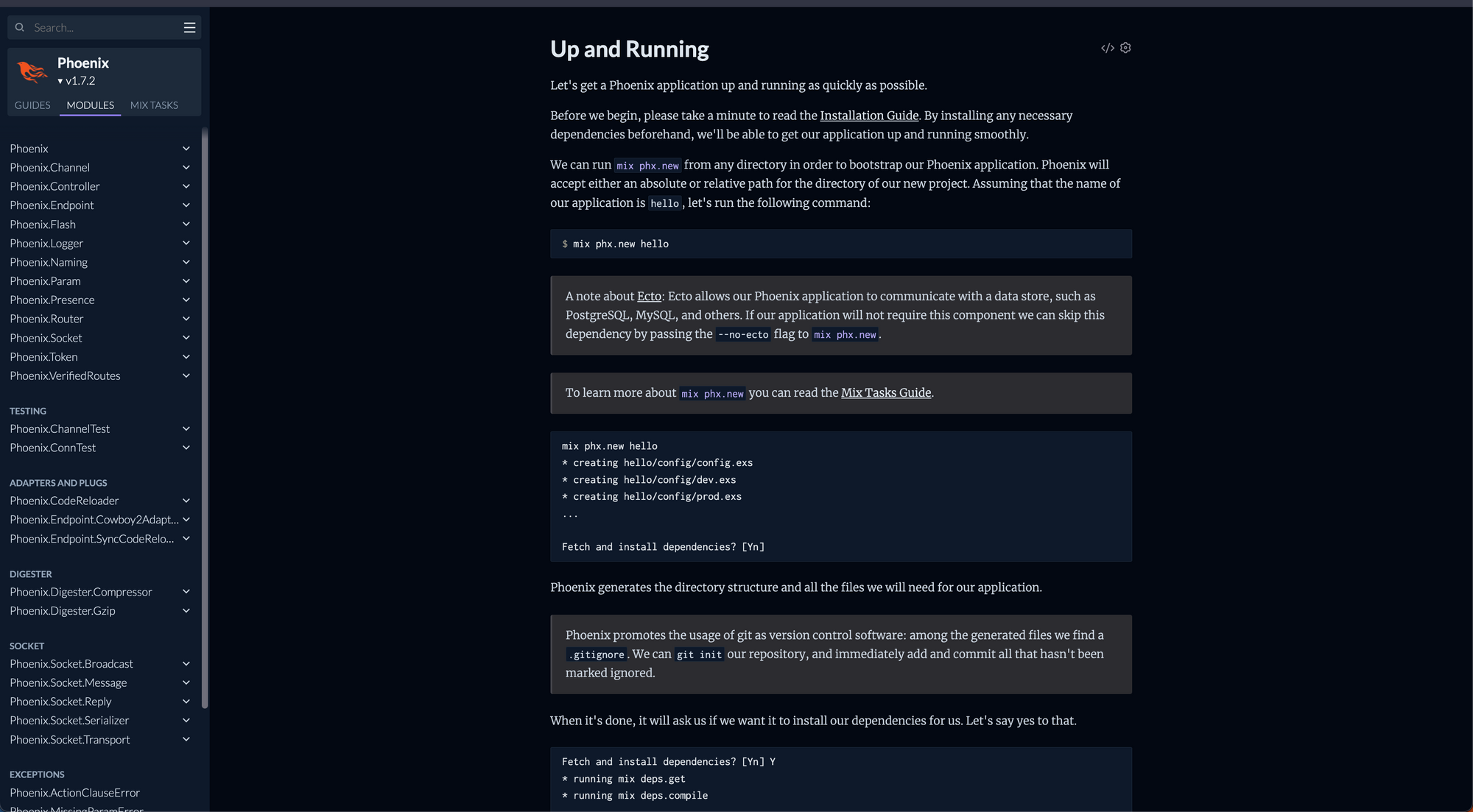 Due to the nature of HexDocs, the documentation ecosystem for Elixir, things are mostly broken up from the API, but less so on guides like you'll find when learning a frontend framework like Angular, React, Svelte, etc. I've had this experience with other backend languages like Java and Kotlin too, but the problem with only having mostly API-focused documentation is that you have to know what you're doing and can't explore things as easily as a newcomer.